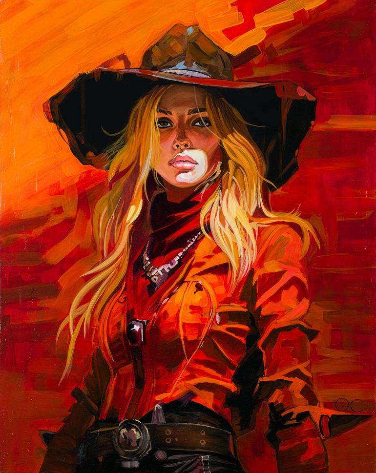 A strikingly beautiful blond cowgirl takes center stage, emanating strength and determination. With a challenging gaze upon her face, she stands tall, embodying resilience and fearlessness. Her physique reflects her physical prowess and unyielding spirit. A wide-brimmed hat perches atop her head, ca...