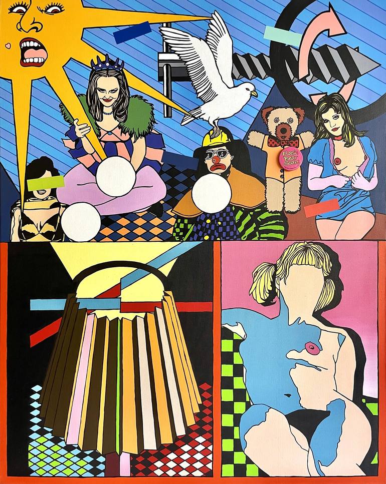Painted in acrylic on canvas and stretched on museum quality stretchers. Includes canvas covered metal button badge 70mm dia. The subject matter is a surreal and randomly juxtaposed montage of fantasy, dream-like images.