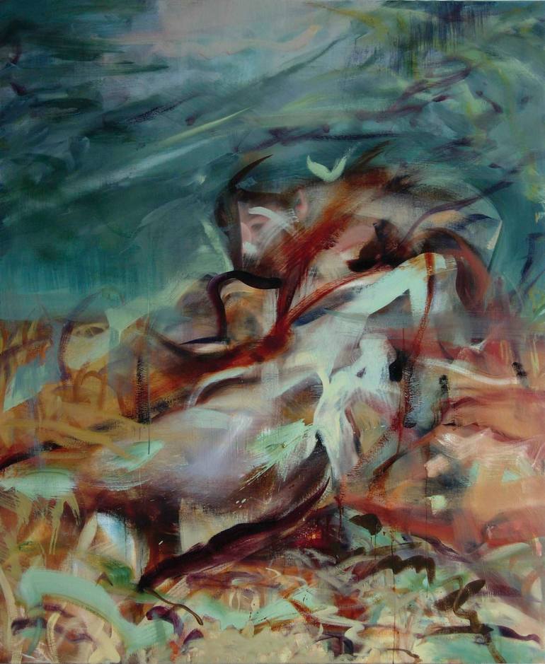 The painting started out as a figure in a chair in a landscape. At a certain point during the year it took me to finish the painting, the figure became immersed in dense turquoise paint, and it appeared to be a piece of coral underwater. The title comes from the surrealist practice of randomly taki...