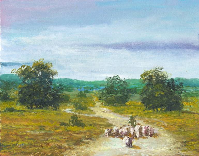 Flock of sheep on the road Original oil painting on paper sheep graze in the meadow sheep on a village road rural landscape sheep 9.8 x 8.3