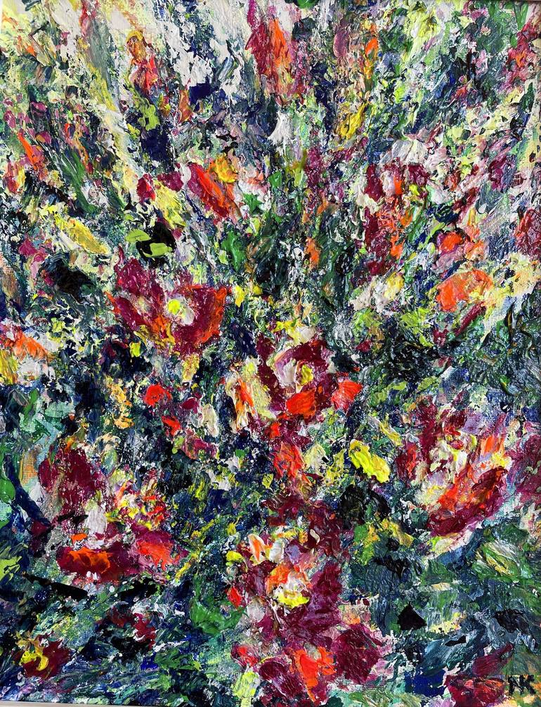 The artwork is a vibrant abstract painting featuring a rich composition of colors. Dominated by bold strokes and thick textures, it showcases an explosion of bright reds, oranges, and yellows interspersed with greens and blues, suggesting a floral theme. The use of color and texture conveys a sense ...