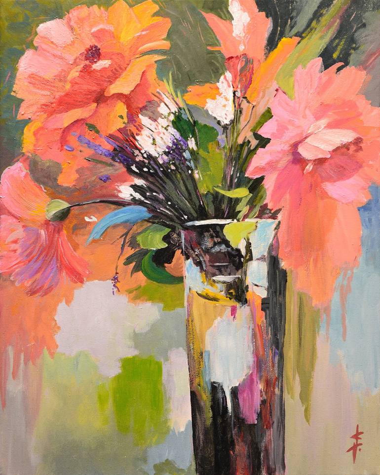 “Floral Dance” captures the vibrant motion of light crimson flowers in shades of apricot, elegantly arranged in a glass vase. The abstract expression of the flowers’ dynamic movement fills the composition with energy and emotion, creating a harmonious flow between color and form. The rich, expressiv...