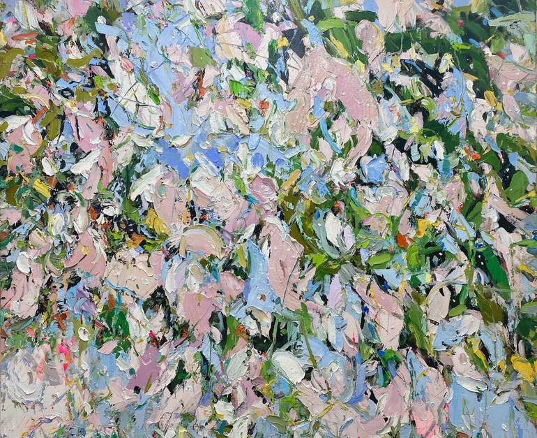 Studio Schaumloeffel - Contemporary oil painting in the Cotswolds. Paint is to be relished on many levels, from the instinctual and emotional, to the sensual and evocative. My thinking is centred on the activity of applying paint, and I feel as well as think through it. - About Painting Paintings I am interested in sharing my observations of my immediate surrounds and perceptions of the senses through the medium of colour, gesture and paint. My paintings contain a sense of nature and of florals but are not depicting a specific flower or element in nature. While the observations and subsequent expressive marks are very personal, I entice the viewer along to visually explore, to find themselves engaged and identify with the painting on a personal level. The joy and pleasure is in a swath of paint that leads you into the painting, in marks that have a physicality to them, a dominance then offset with some flirtatious flicks of colour seducing you to a smile. My studio is filled with the smell of oil paint. You find big heaps of paint on my palette, stacks of art books and seductive colour-pops in the form of collected mementos, cards with dried clumps of discarded paints scraped from surfaces, small colour studies and fresh flowers. Creativity being a process, many painterly decisions are made along the way, not all successful, many surprising, but all adding to the joy of creating, of pushing paint, of playing with colour, aesthetics, and visual design. These traces of the creative process are an essential part of my work. My fundamental quest is to express something personal in a bold yet playful way, composing lively, elegant, emotion-filled and playful abstracted scenes. My love for lush rich oil paint shows in the application and the dynamic surface of my works of art. What excites me is the direct dialogue between the canvas, the paint, my gestures and my brush. The paintings don't just paint themselves in an obvious way but I work and wrestle, sometimes dance with them it feels. The narrative is in the paint itself and laid bare by way of application. I hope they are accessible to all, not complicated but bringing the viewer a reaction that involves vision, touch and smell. This intimate chat between me and my paintings leads to engaging multifaceted works that are fresh and very personal. You are invited to join the chat!