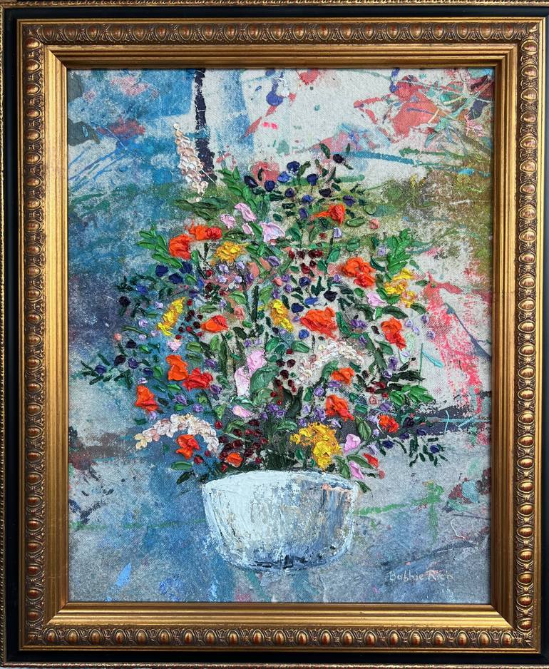Introducing Wildflowers. These raw, yet exquisite palette knife paintings are created on hand stretched drop cloths. Wondrous layers of paint from hundreds of my students flicker beneath the decadent florals. Impasto oil paint flourishes on top of the raw, repurposed cotton. Drop cloth canvas is st...
