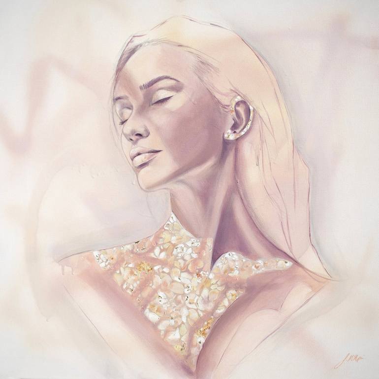 ‘Flourishing in the Light' was inspired by a female portrait with the sun shining on her, and instead of light hitting her chest, she blooms with thick abstract floral brush marks in oil paint with specks of 23ct gold leaf. Painting framed in gold frame, ready to hang.