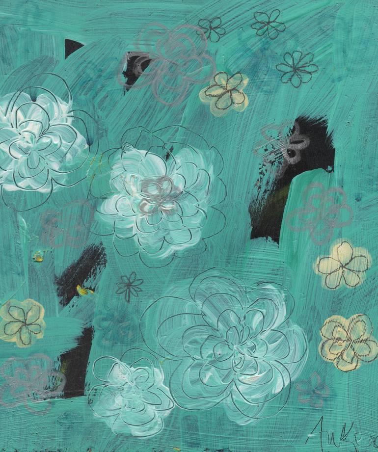 This is an expressive and whimsical interpretation of flowers in acrylic paint, on a thick wood panel. The sides are painted black.