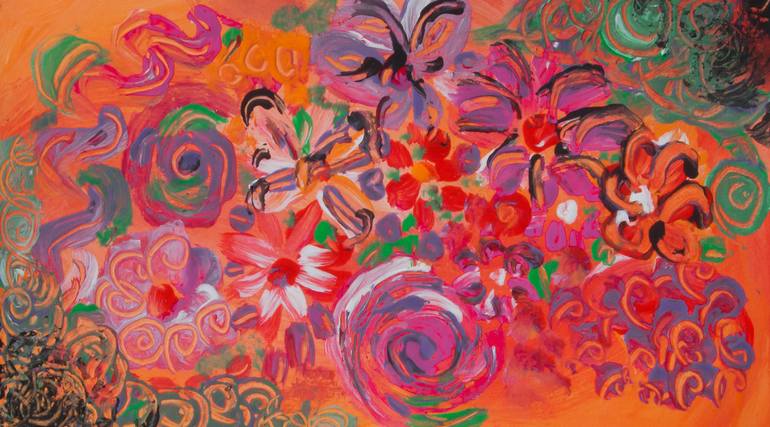 Flower garden composition like image in orange, pink, fuchsia, purple, violet, green, red, white and black colors. Miniature painting realized with tempera colors on a small size orange colored cardboard
