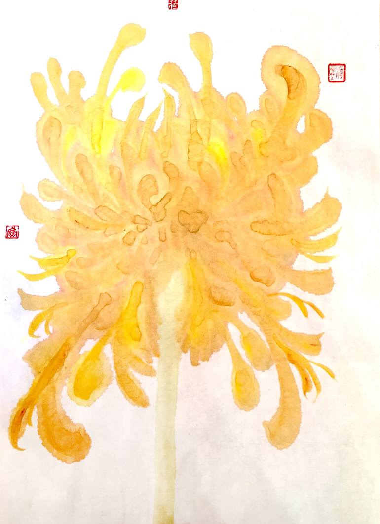 Flower Universe Series 07 is the title of this artwork which ink on paper draw about a yellow flower growing super health and shinily. Yellow is warm and bright. left side stamp mean: fish, same sound of cantonese "left over" , which mean more than enough, you have something left. upper middle st...