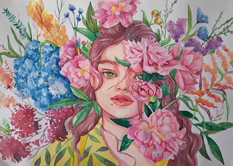 girl with a bouquet of flowers watercolor paper , 300 gr, aquarelle