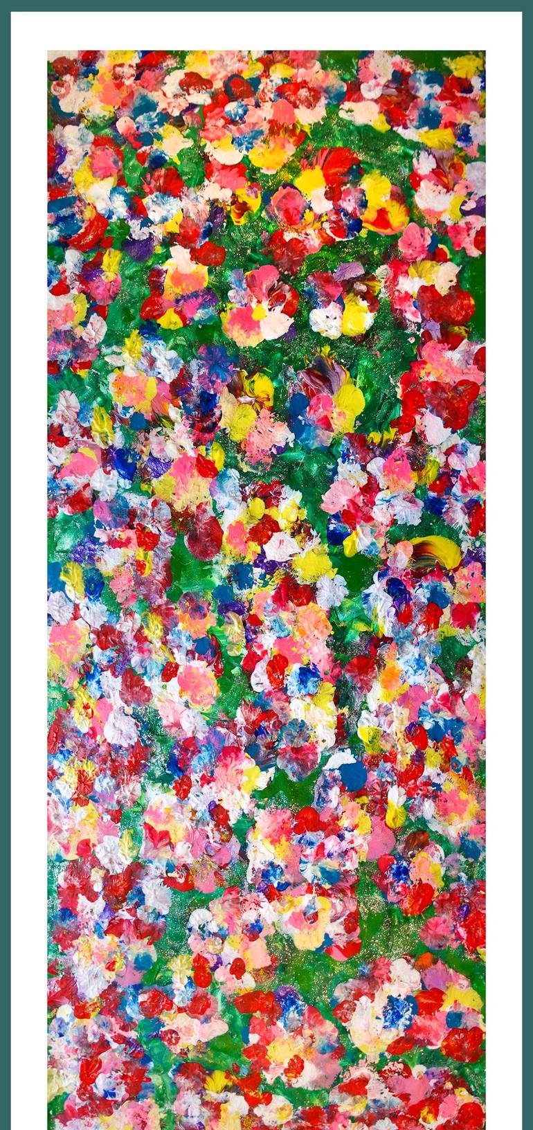 There is nothing more beautiful than a walk through a flowering meadow early in the morning with the first rays of the sun... The vibrant color of the artwork is the feeling you get when you take a morning walk through a blooming meadow... Acrylic on canvas, 120 x 48 cm.