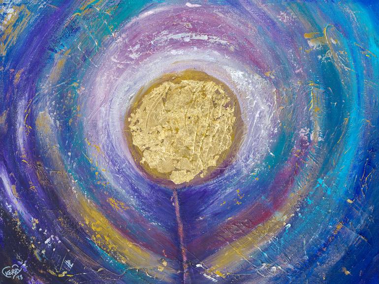 'Flower of Gratitude' With the words "I am Gratitude" painted on the canvas after a meditation, this painting of an abstract flower is the final result, and hence the title. Full of texture and with gold leaf, this painting is better in person as you cannot capture the true beauty of it in a photo...