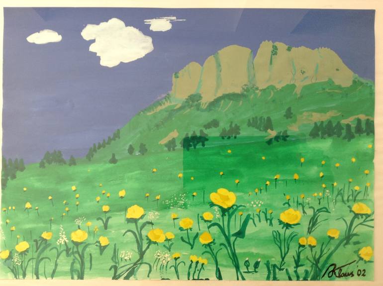 View of a high alpine meadow in the background a part of the mountain range of "Latemar" in South Tyrol in Northern Italy on the side of the "Val Badia". Imagine lying on the lawn and enjoying the fresh scent of yellow flowers and admiring the panorama, immersing yourself in partying. Also featured ...