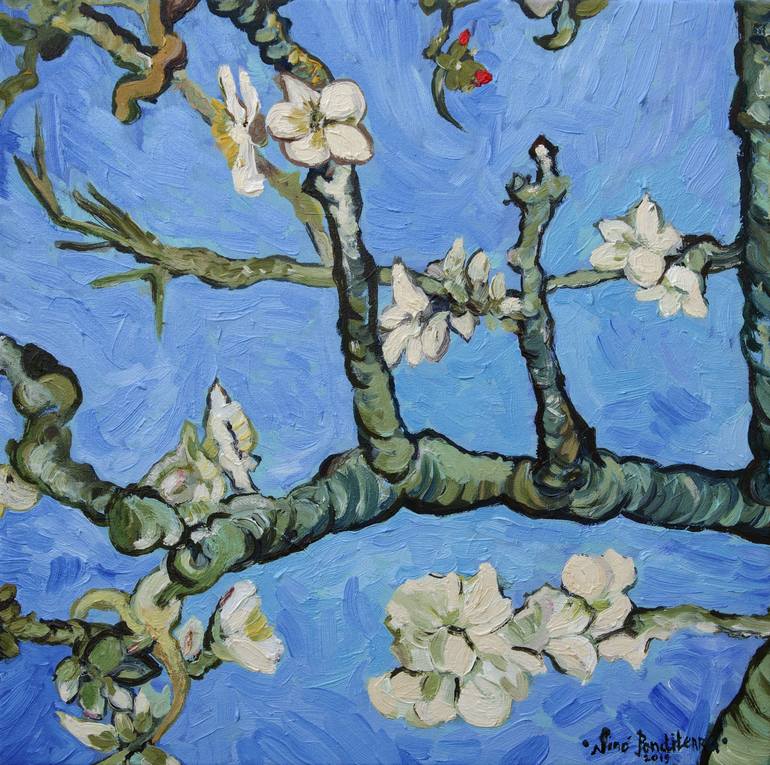 Title: "Flowering almond branches" Size: 30x30 cm (11.9" x 11.9") Medium: Oil on stretched canvas (gallery wrapped), ready to hang Year: 2019 Description: From the series of paintings - «Through the eyes of Van Gogh» Copy of the part of the painting by V. Van Gogh "Blossoming Almond Branches" Oil...