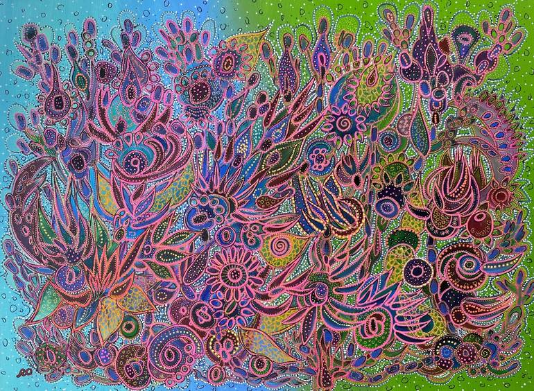 Original painting "Flowers Fireworks” Size: Height 18 x Width 24, Depth 0.6, Inches. Materials:Acrylic on canvas, acrylic pens. Subject: Flowers. Style: Impressionism, Contemporary, Modern, Decorative.