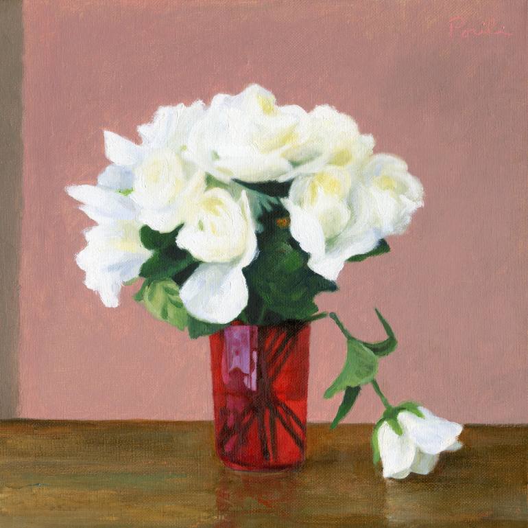 This oil painting is one of a series of flower paintings from 2019. It is inspired, in part, by Manet's late flower paintings. The composition is simple and frontal, in a square format. The flowers are arranged in a clear vase, to catch light reflections, and are placed on a plain tabletop close to ...