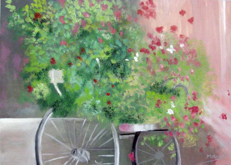 Oil on wood flowers, flowers with many colors on a bicycle