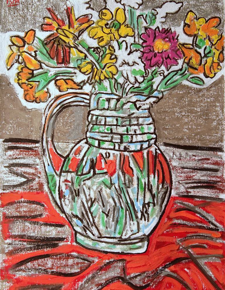The painting on canvas ships unstretched. I was inspired to approach a traditional still life with a fauve injection of energy. I hope the viewer feels the excitement. I worked from a pastel drawing and translated the design in to oil on canvas.
