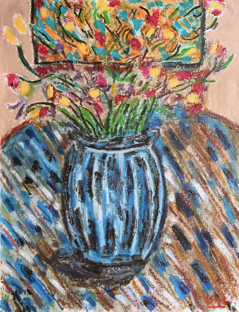 This is an oil on canvas which ships unstretched. I was inspired by a traditional still life and then painted it in pastels. This oil painting is a growth from the original drawing and grew into something else. I hope the viewer feels a richness of life. My favorite medium is oil on canvas in a mult...