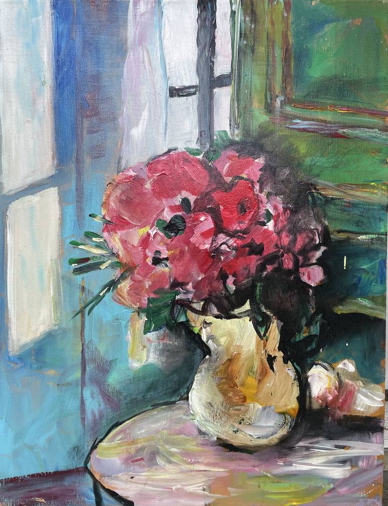 I painted this after a museum visit and I was drawn to flowers with windows. To me, it is interesting to see nature placed inside a room. The color blue was a good foil for the reds and the window brought the outside light into the room enlivening the colors of both the walls and the flowers. I h...