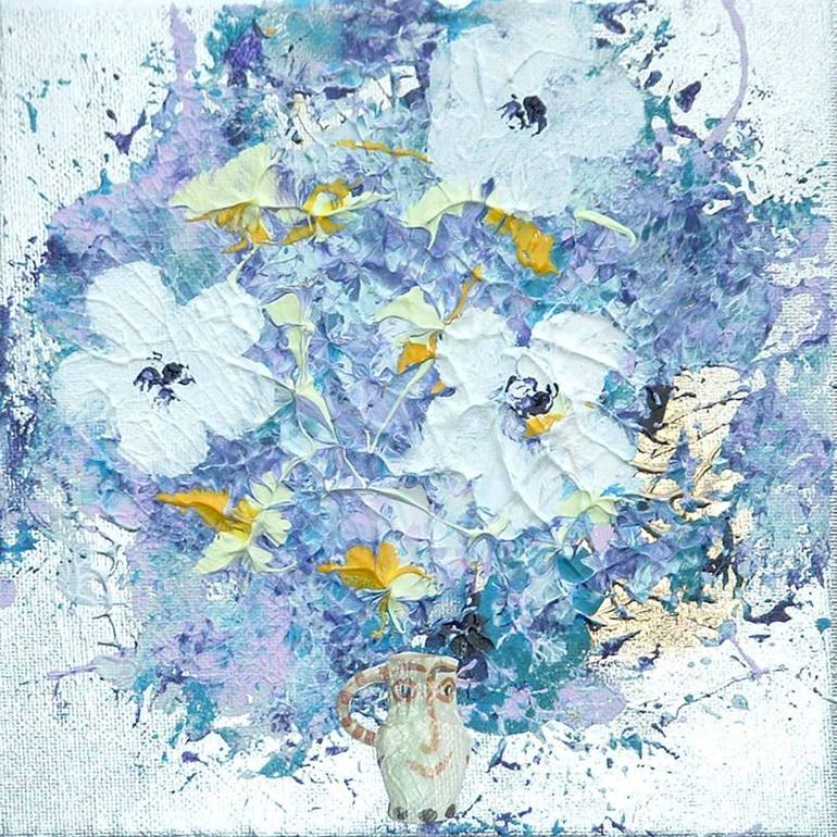'Flowers in a Picasso Pot' mixed media painting and collage. The original is sold, so only available as a print. Inspirations and links to art history: Pop Art influenced this painting with the image of Picasso's famous ceramic pot from popular art culture collaged into the painting.