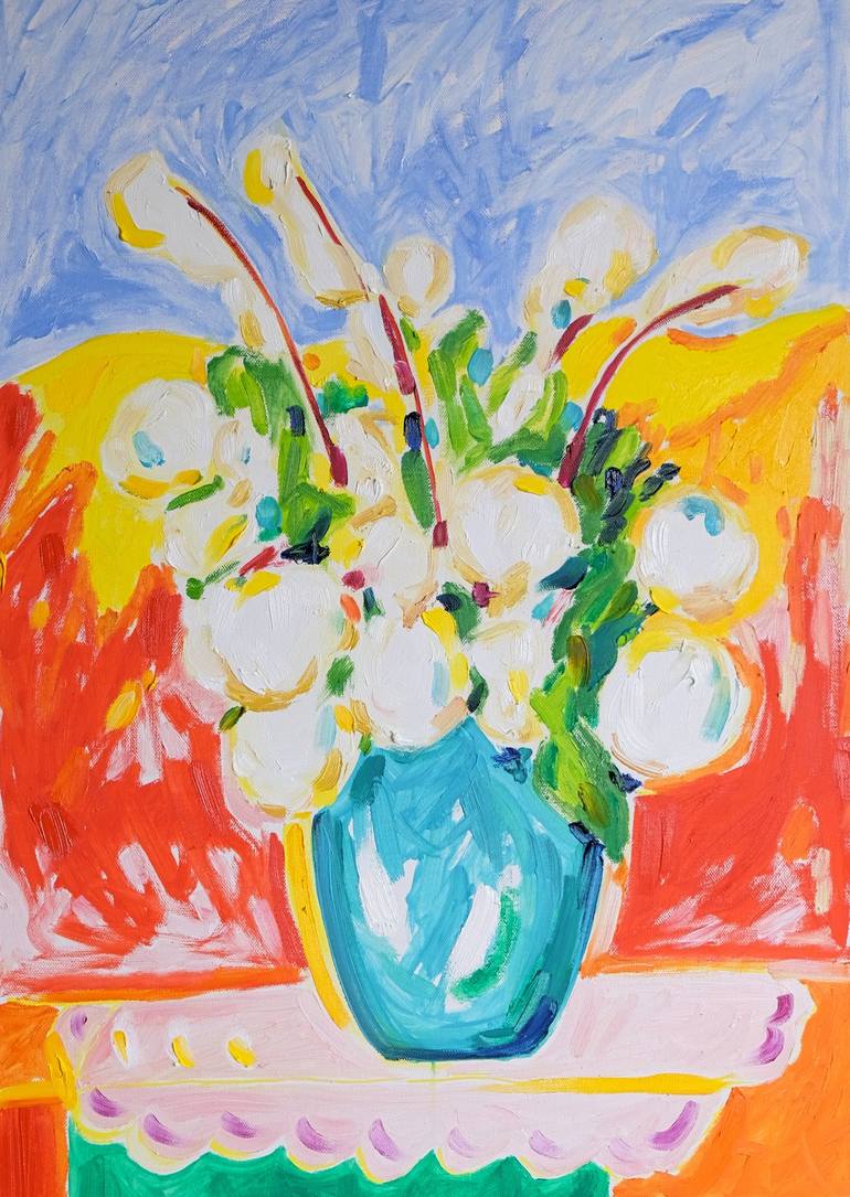 Flowers in the Window is original artwork by artist Tamara Jare. White viburnum in blue vase, artwork for the new collector, artwork for gallery wall, decor for living room, vibrant colors, hope.