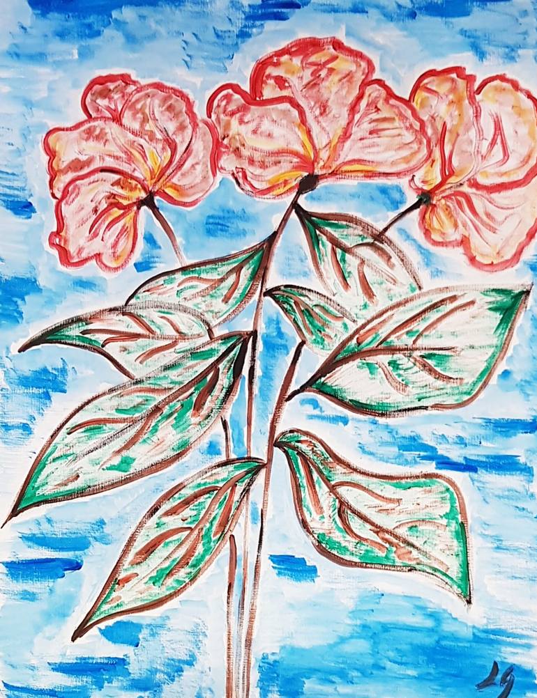 This is an abstract paint of flowers with a blu background and it would like to represent the beauty of flowers.