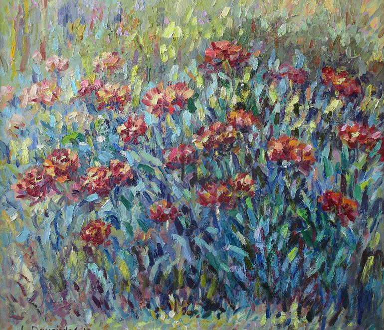 The contrasting colours of dark red and various greens creates the rhythm of dancing flowers in the wind. Original oil painting on canvas. The flowers are painted in the manner of Impressionism.