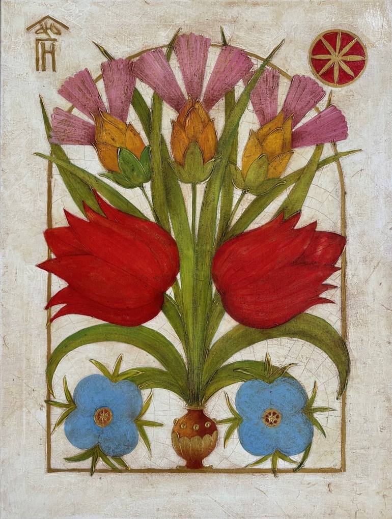 This stunning original piece titled “Flowers” was created by contemporary Russian artist Vyacheslav Gayun in 2024 and is available for purchase online. The painting features a decorative style, showcasing a composition of stylized flowers arranged in a vase. The focal point is two large red blooms,...