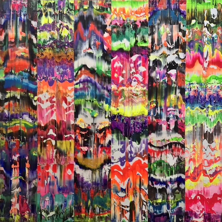 The title Flux refers to the fluidity and movement of the paint and the way it changes as viewed. The paint is a mixture of pure and mixed colours, metallic and fluorescent which vibrate and contradict in harmony and disharmony yet overall form a unified image. The paint is dragged and poured in ban...