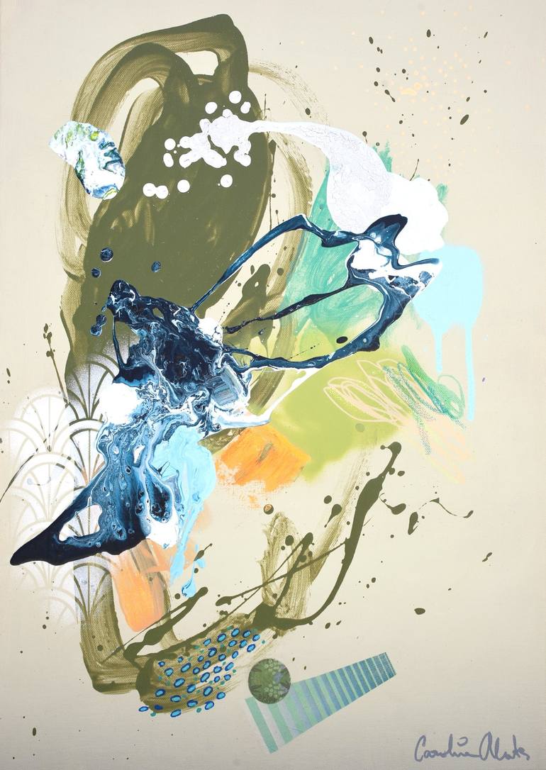 This painting is a lively abstract composition featuring a dynamic blend of colours and textures. Bold strokes of blue, green, and orange swirl across an olive beige background, creating a sense of movement and energy. Splashes of white and hints of peach add contrast, while intricate patterns and l...
