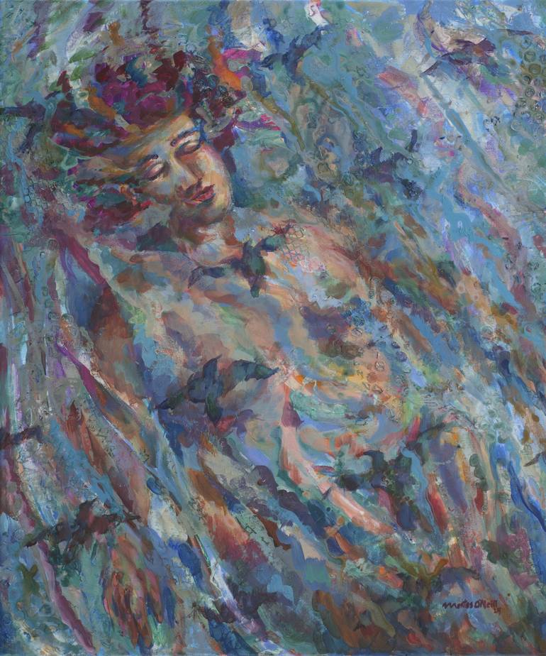 In “Fluyendo entre Gaviotas” (Flowing among Seagulls), acrylic textures breathe life into a moment of serene surrender. A woman floats, carried by undulating strokes of blue and turquoise, while the fleeting shadows of seagulls sweep across her body and the water’s rippling canvas. The painting weav...