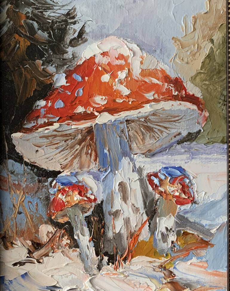 Fly agarics in winter forest.#10 Original oil painting on canvas board. 15x20x0,2cm; 20x25x2,5cm (Framed); ► Sign on the back by the artist. ►The painting is sold FRAMED and ready to hang. ► High quality varnish protects the colors for extended time and against changes in room temperature, and to ...