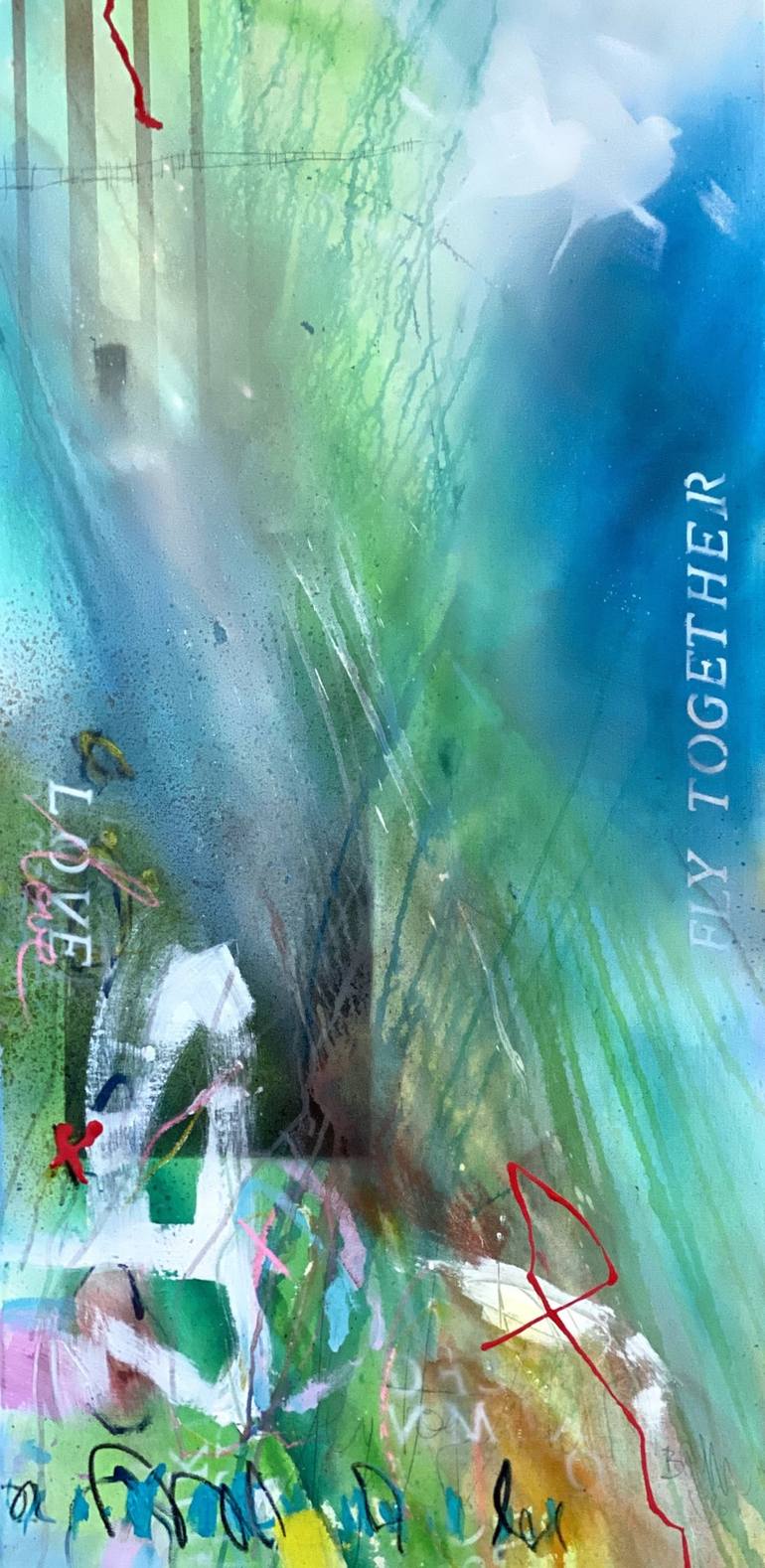 fly together II #love is a mixed media painting ( acrylics, spray paint, gold spray, pastels, pencil ) sized 60 cm W x 120 cm H x 4 cm deep/47,24 in H x 23,62 in W x 1,57 in deep. Edges are painted, so framing is not necessary. It is varnished for protection and ready to hang. Upon first looking at...