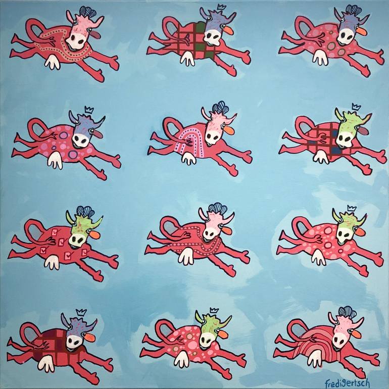 Departure into a world to be thought of anew. What if all the cows could fly? Would they continue to stay in their pasture? Kuhle Bilder® by Fredi Gertsch bring good mood into your life. You will always briefly escape from everyday life thanks to the colourful cheerfulness in your rooms. The pop ar...