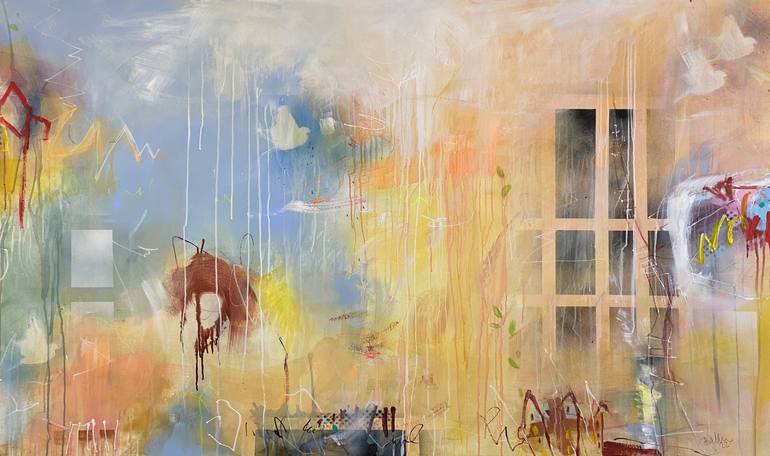 Flying Home No.1 is a 200 cm/78,7 in W x 120 cm/47,24 H in, 2,5 cm/1 in deep mixed media painting. This Series is called „Home“. Home is love, trust, confidence and hope. It is a safe place and a comfort zone. A place to live with our families and enjoy with friends. A place to build memories as wel...
