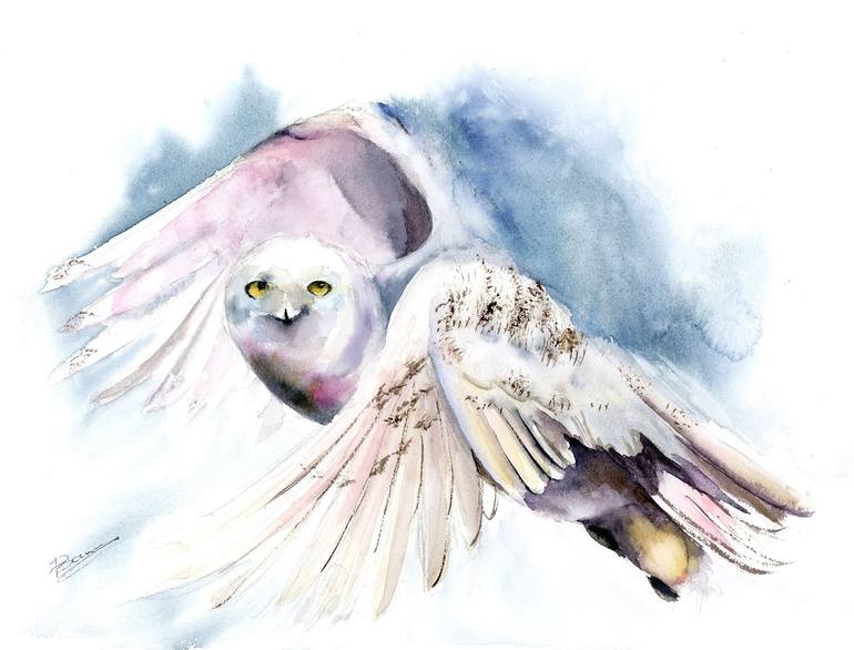 Flying Polar Owl - original watercolor painting Signed front and back Dated on the back. Not framed.