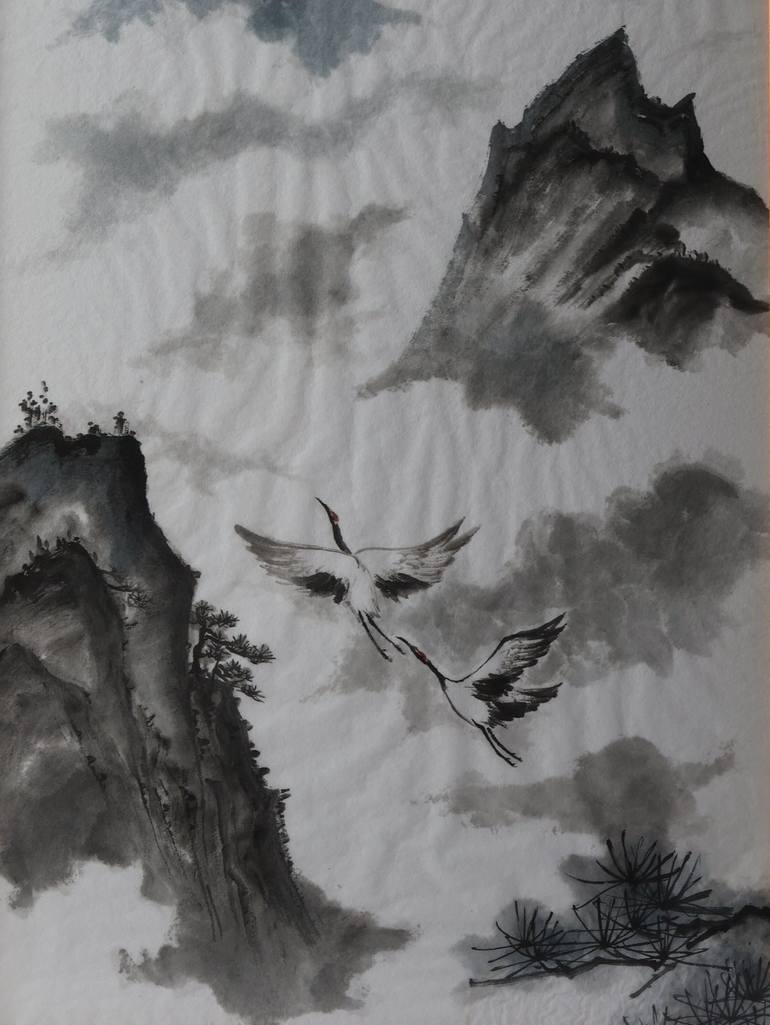 Este cuadro en estilo chino muestra dos grúas volando a través de las montañas envueltas en niebla. Las grúas, símbolos de longevidad, sabiduría y buena suerte en la cultura china, representan un deseo de prosperidad y armonía. La atmósfera serena y misteriosa, capturada con trazos fluidos y delicad...