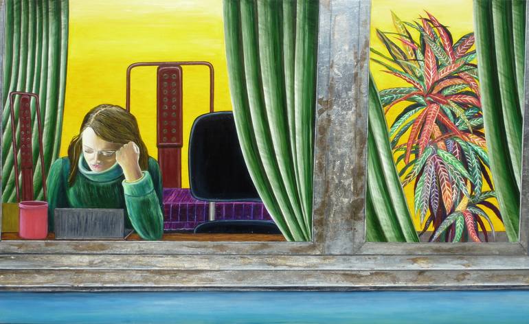 A girl is fucused on her homework behind a window. Mixed media artwork: tempera, oil and silver leaf on plaster prepared wood panel. It was painted with the highest quality materials. This painting is signed on the back and includes my Certificate of Authenticity. With frame and ready to hang. Packa...