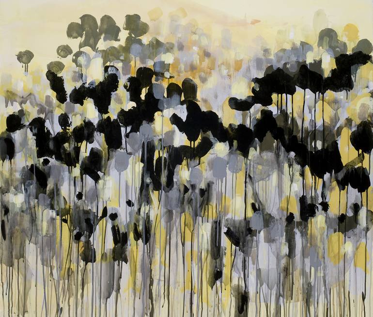 An abstract take on trees, light, and landscape that dissolves into painterly dots and drips. This is a framed work on paper, but can also be shipped unframed.