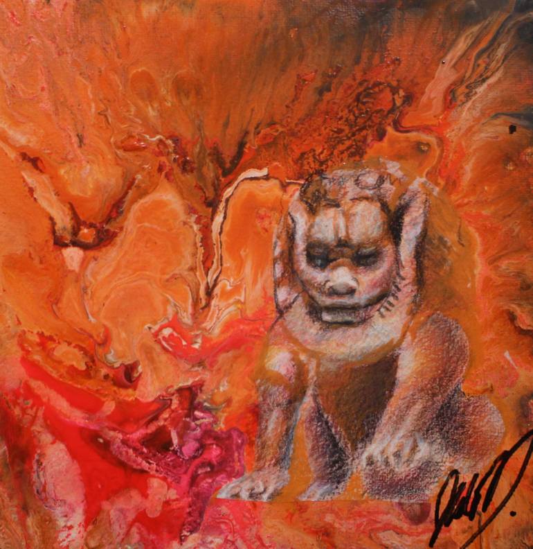 Foo Dog is a mixed media piece on canvas board. Red dominates the palette. Easy to frame.