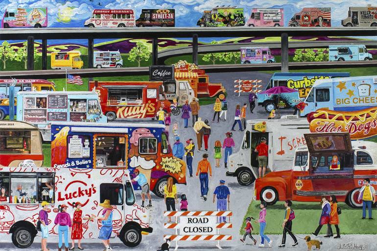 With vibrant acrylics, I've captured the bustling vibe of a festival dedicated to culinary delights. Each brushstroke conveys the movement and energy of food enthusiasts exploring an array of colorful trucks, each a beacon of unique flavors. This painting is a tribute to community, diversity, and th...