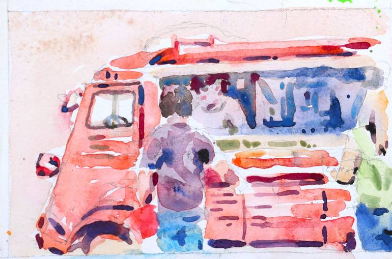 watercolor on paper . Done on location. The food truck was parked outside of the museum. Thought is a fun subject