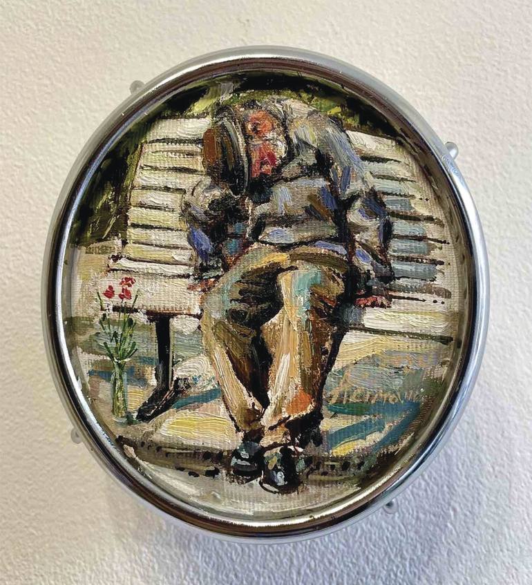 A powerful message about love that transcends the boundaries of age, the longing for closeness, and the tenderness that remains unchanged despite the passage of time is at the heart of this artwork. The scene is set in a city park, where an elderly man is depicted sleeping, with a vase of flowers be...
