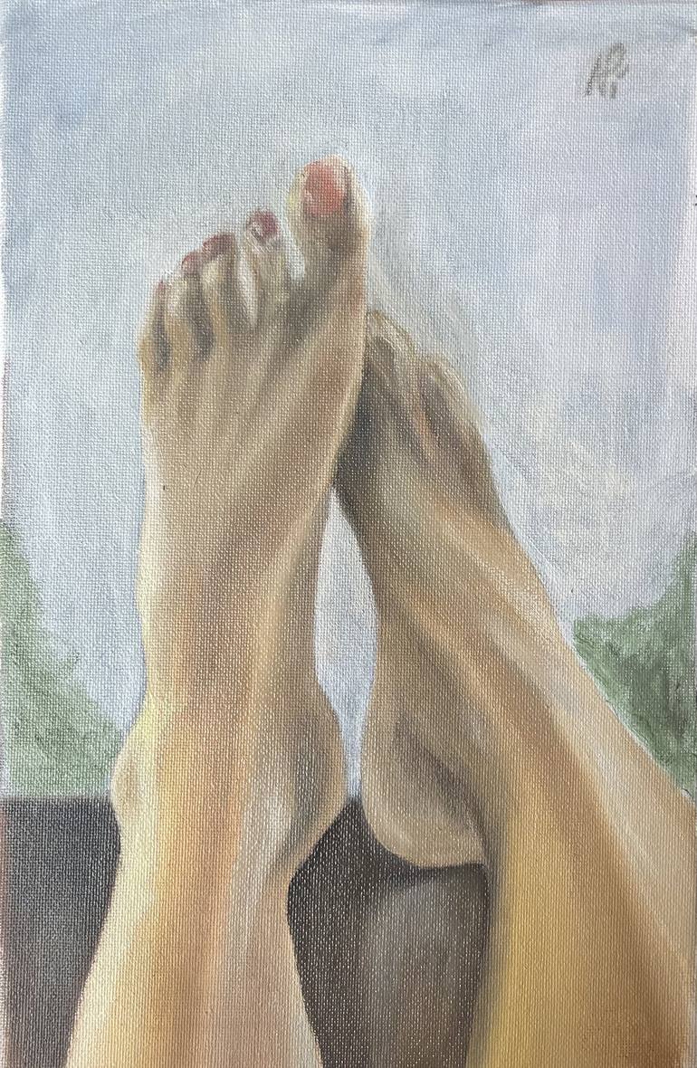 Inspired by Tarantino movie feet in the car while driving in hot summer noon. You will receive this oil on canvas in box, gift wrapped. Can repeat it with your feet / landscape, any canvas size. Thanks for your attention.