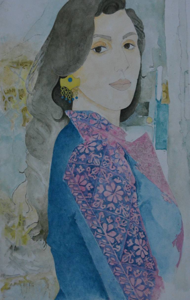 A beautiful girl dressed in floral clothes from the Levant It has decorative architectural units Water colors on cardboard