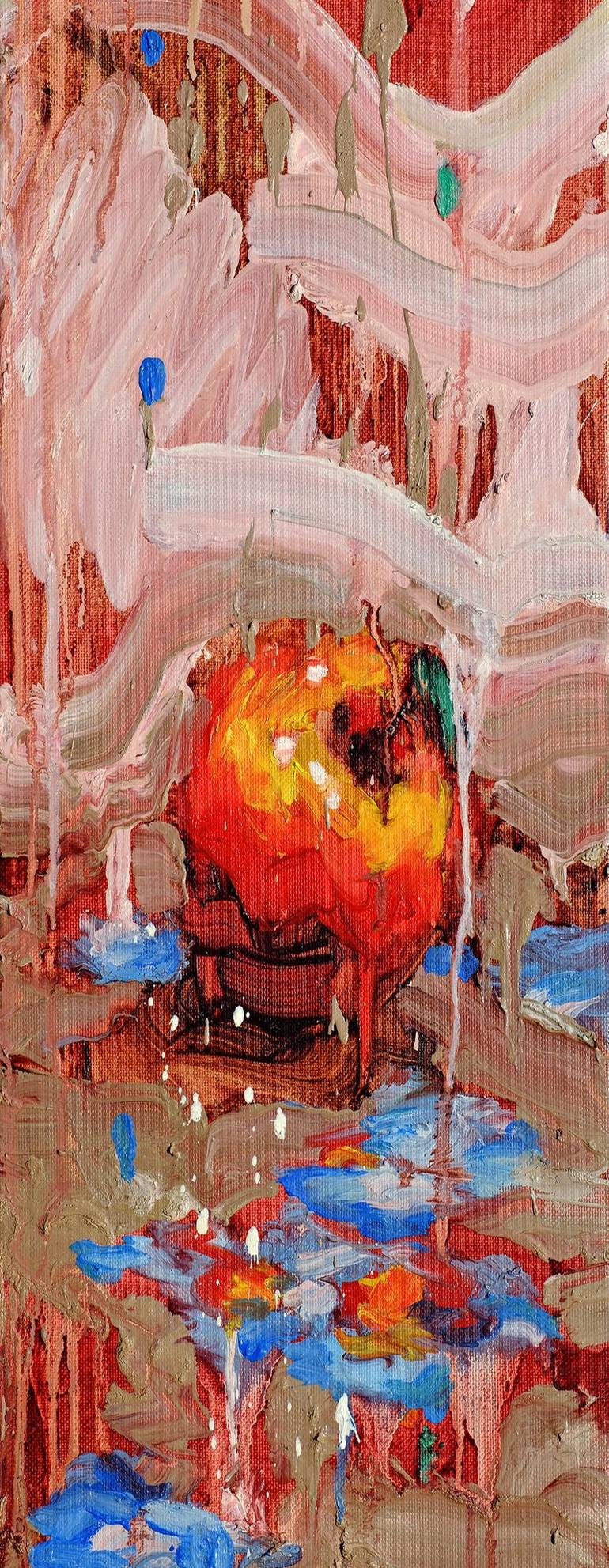 The kairos (taekgeun Song) began his artistry with doubts about the existence of God. He looked for evidence of God’s existence by experimenting with the hypothesis that if God really existed, he would exert some influence on those that try to communicate with him. He waited to capture God’s influence, by orchestrating a situation in his life where if God were to exist, he’d have no choice but to be influenced by the word of God. However, having lived a strict, disciplined life for a long time, he noticed various desires erupting in his mind. His work, which is based upon stories of good and evil, is composed of various organisms and forbidden fruits. Our desire to be tempted by forbidden fruit, and the consequences of eating it, has continued to manifest within his storytelling as themes of sin and death. The author, the kairos, values improvisation in his work, rather than following elaborate methods. Through the use of oil paintings, quick and tough brush strokes, and the uncontrolled flow of paint, viewers can feel the artist’s personality, mood, emotion and behaviours at the time he created the work. The artist continues his storytelling by continuing to develop a series of new works.