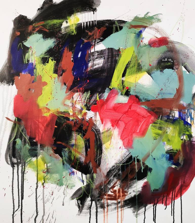 Abstract artwork realized with energy and spontaneous gestural. Dark palette used, black, red, blue, and green on a white background. Dripping. Signed on verso and on certificate of authenticity Ship in a box, ready to hang.