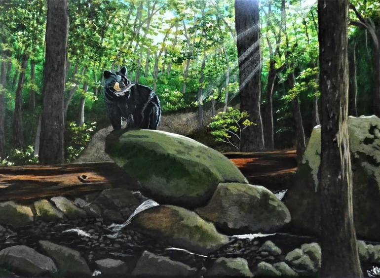 Forest Bear is an acrylic on canvas of dimensions 18" by 24" This a photograph taken at the Rainbow Falls near the Sugarlands trail that we had just recently visited. The huge rock was so captivating that I decided to place a black bear that is native to these places on the rock with his recently ca...