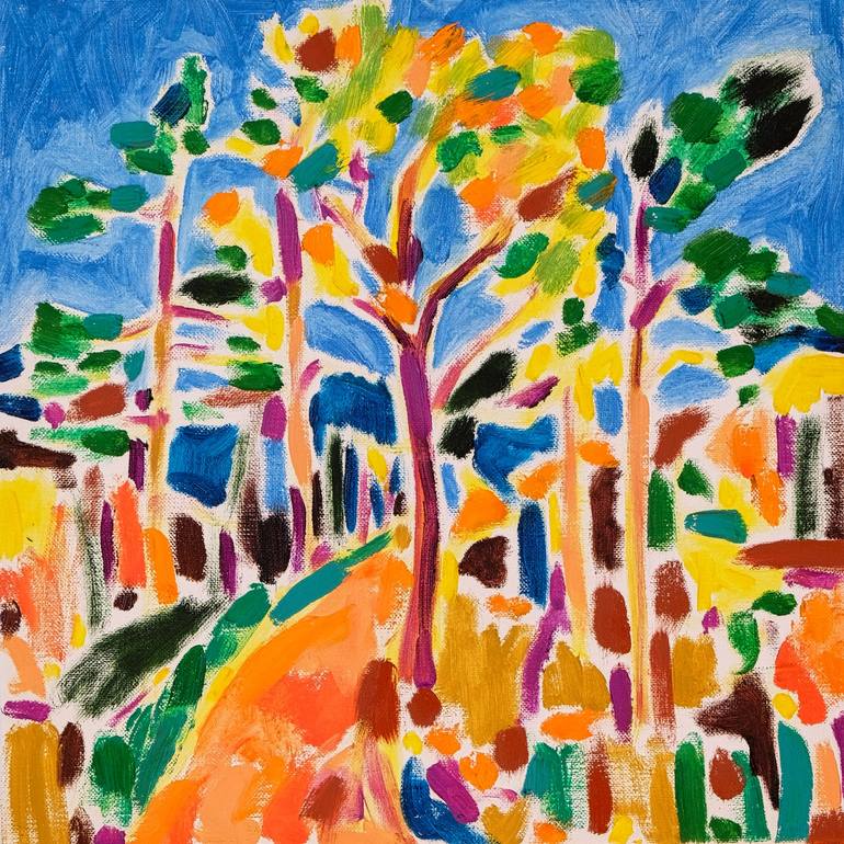 Forest No. I is contemporary artwork by Tamara JAre. Colorful nature in bright colors, vivid original, beautuful centerpiece, trees, tree.
