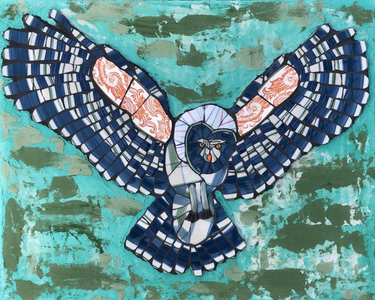 Owl mosaic - dishes, glass & tinted mortar on cement board. This work was created for an online mosaic course, "Learning to Fly" Available here - ?